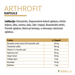 Jedinstvena i revolucionarna formula za zglobove i mišiće Više od 80% odraslih osoba ima probleme sa zglobovima i mišićima, poput bolova, upala i otoka, a uzroci mogu biti reumatske bolesti, povrede mekih tkiva ili sportske povrede. Arthrofit kapsule sadrže ključne sastojke kao što su kolagen, Boswellia serrata, hondroitin sulfat, bromelain i hijaluronska kiselina, koji pomažu u smanjenju bolova i poboljšanju pokretljivosti zglobova.