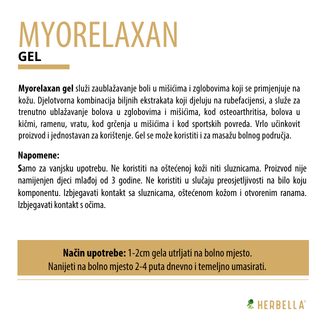 Myorelaxan gel služi za ublažavanje boli u mišićima i zglobovima koji se primjenjuje na kožu. Djelotvorna kombinacija biljnih ekstrakata koji djeluju na rubefacijensi, a služe za trenutno ublažavanje bolova u zglobovima i mišićima, kod osteoarthritisa, bolova u kičmi, ramenu, vratu, kod grčenja u mišićima i kod sportskih povreda. Vrlo učinkovit proizvod i jednostavan za korištenje. Gel se može koristiti i za masažu bolnog područja.